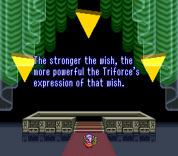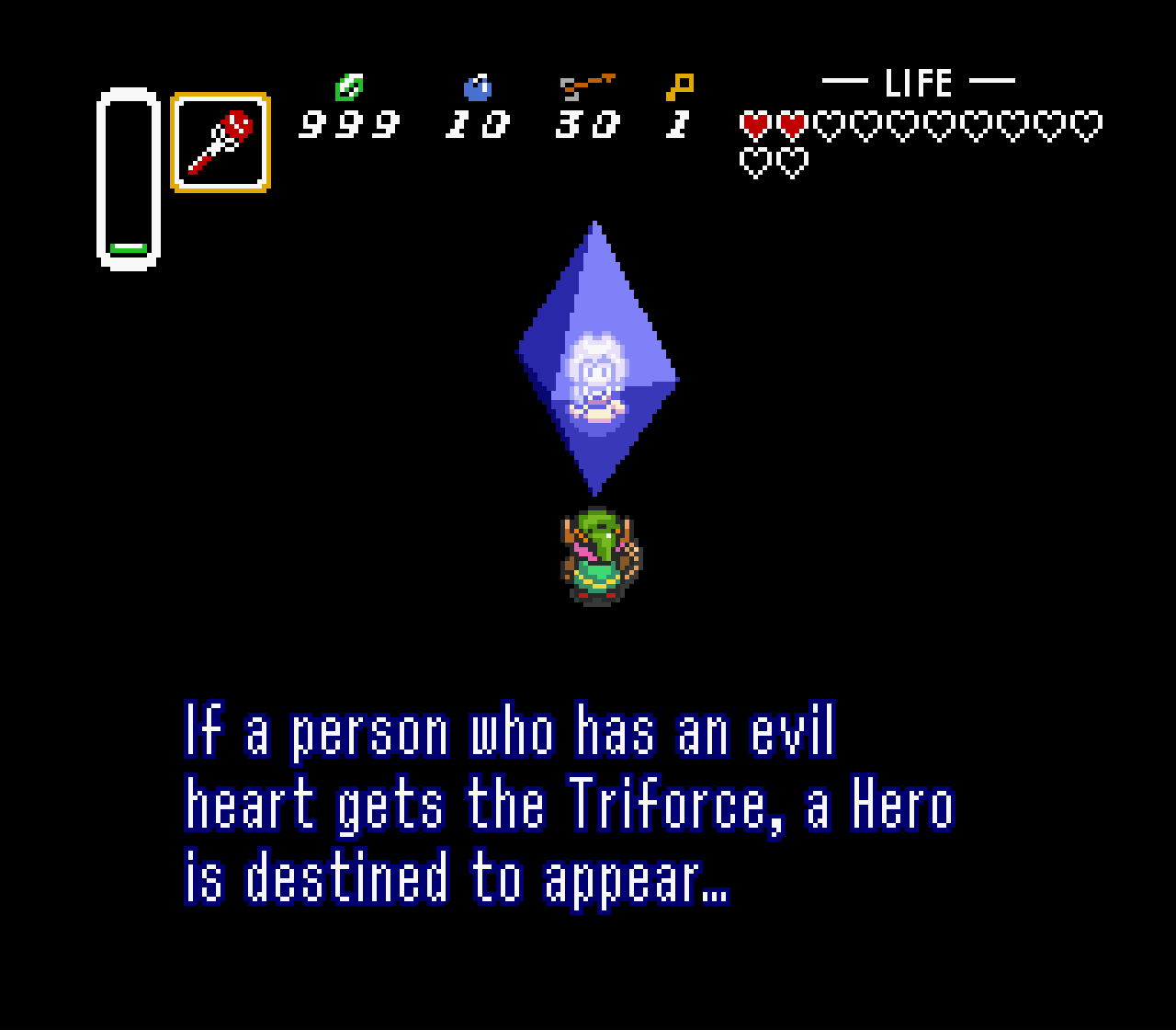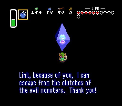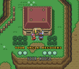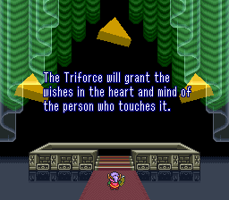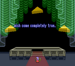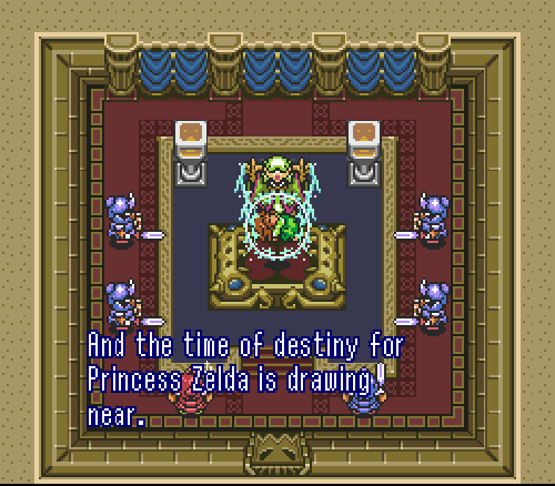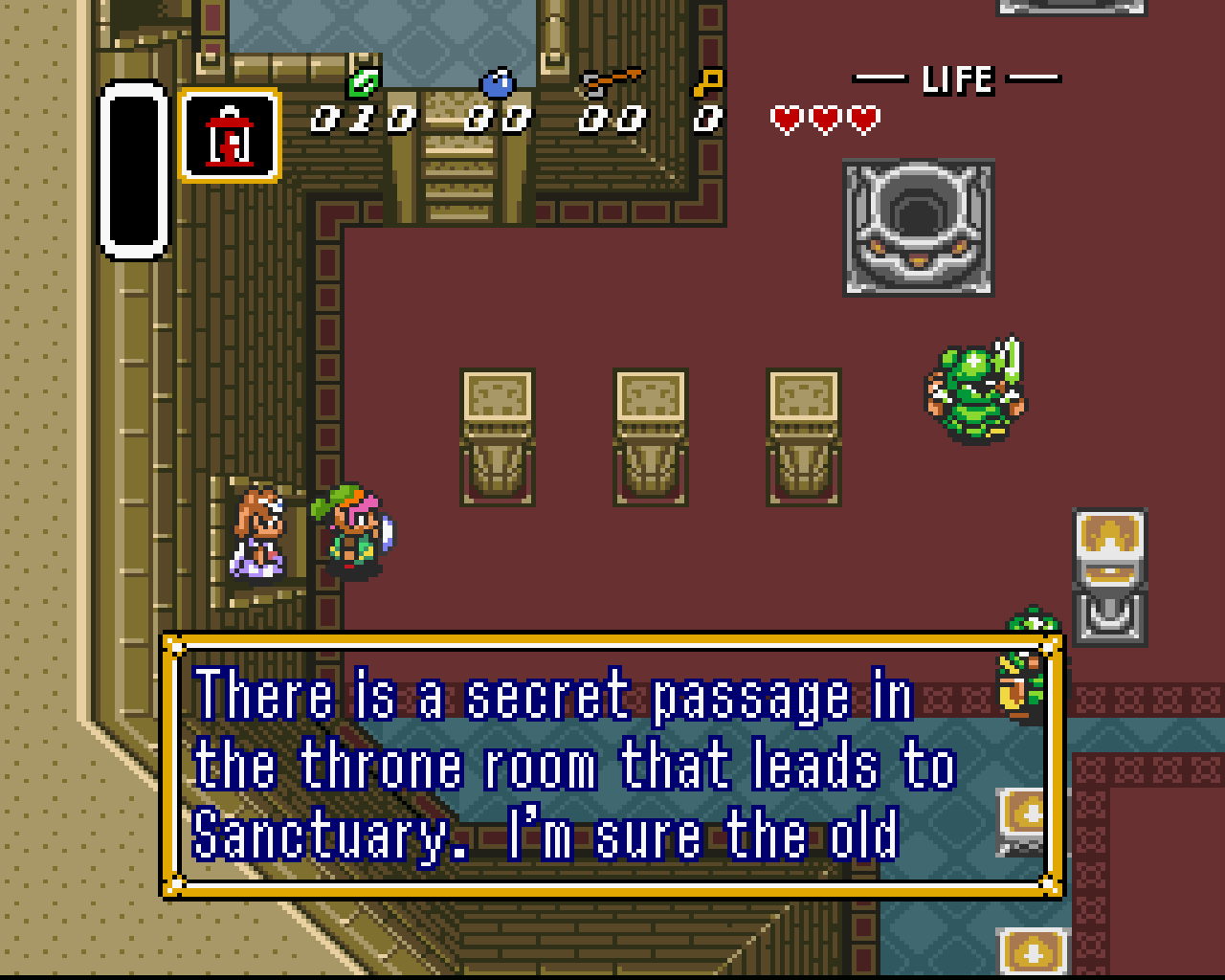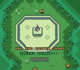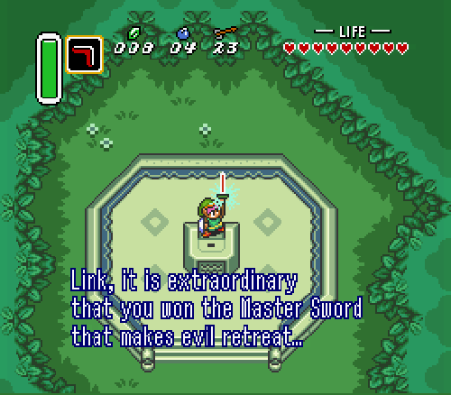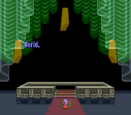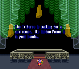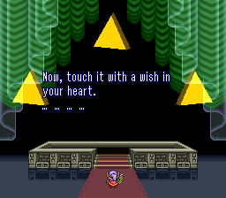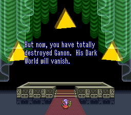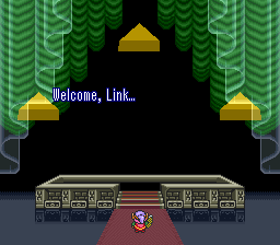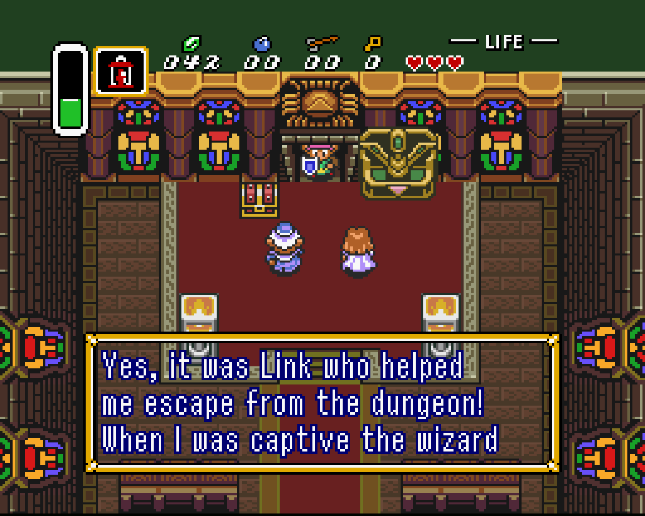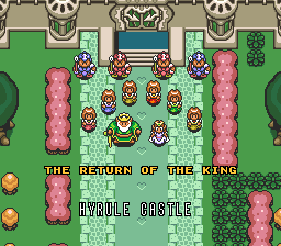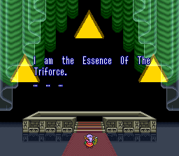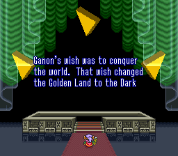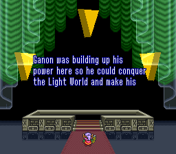 A Link to the Past propose de parcourir un vaste monde qui regorge de zones secrètes donc sa partie, en prenant soin de mettre son nom (ou de laisser Link, c'est bien aussi) et nous voilà directement plongé dans une aventure dont le gameplay, les implications et les enjeux vont aller crescendo. Et il est difficile de le renier mais la narration est maitrisée de bout en bout, notamment parce qu'à chaque boss, la trame de fond refait surface, en nous rappellant à chaque fois pourquoi nous nous battons. Alors certes, les micro-cinématiques (qui sont en fait juste des dialogues) sont bien moins travaillées que l'intro, mais leur présence fait montre, une fois encore, d'une réelle volonté de proposer un jeu nettement plus narratif et détaillé qu'autrefois. Une narration "in game" et non simplement dévoilée dans la notice du jeu, comme c'était trop souvent le cas avant (c'était également une solution de facilité). Mine de rien, Nintendo signait une véritable avancée en termes de mise en scène, chose qui était encore extrêmement rare au début des années '90, où seuls les RPGs pur souche en proposaient plus que la moyenne. Notez également qu'en plus, on nous offre un épilogue digne de ce nom, à la fois long et gratifiant.