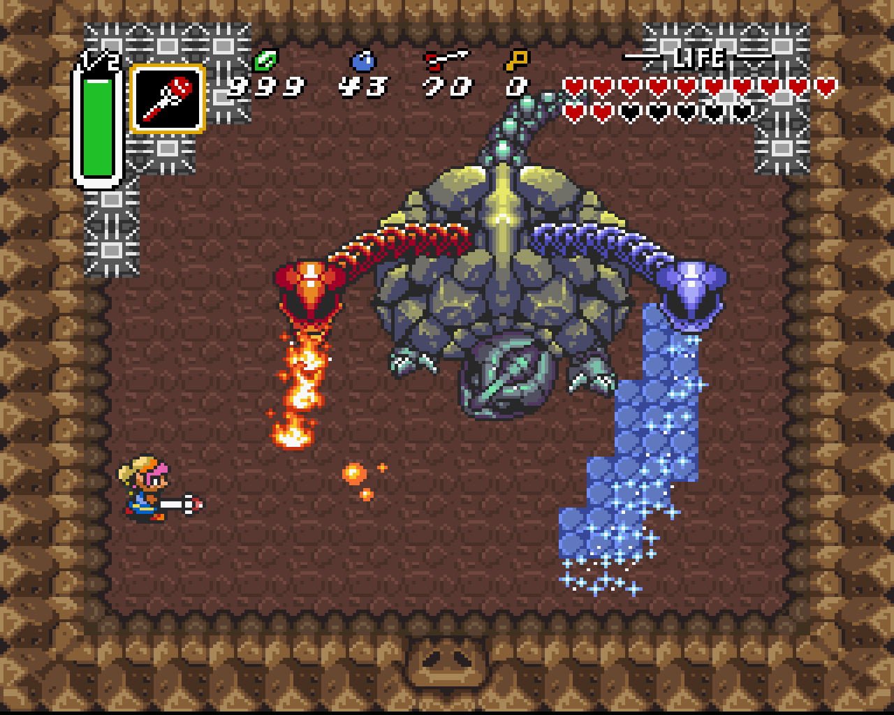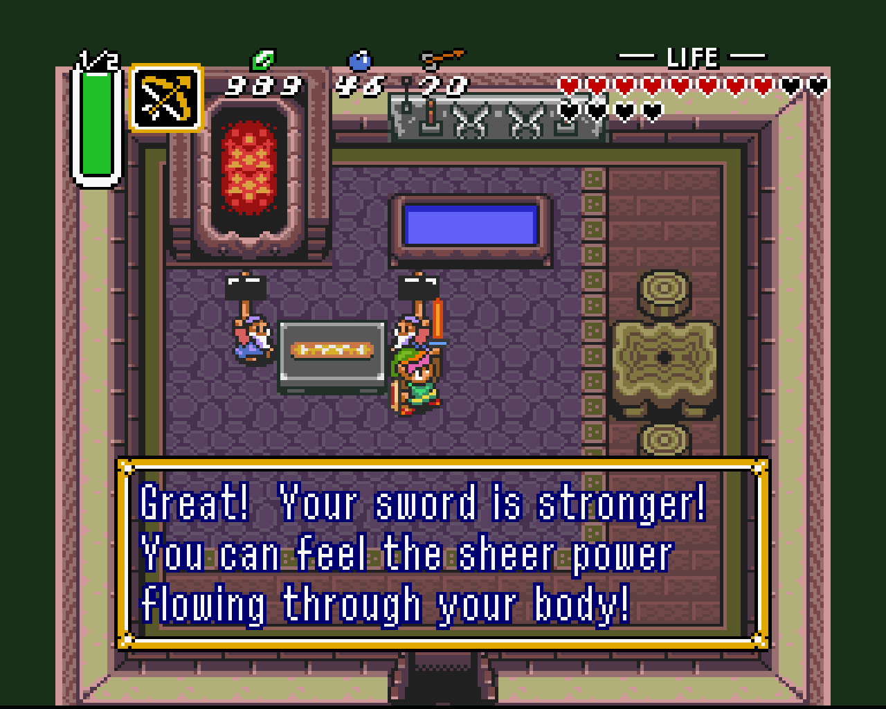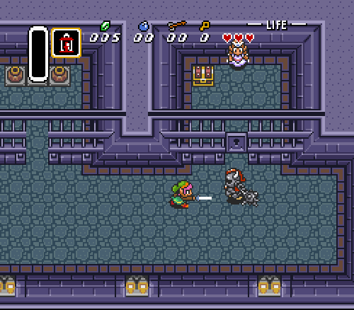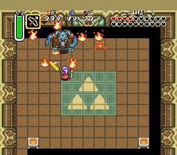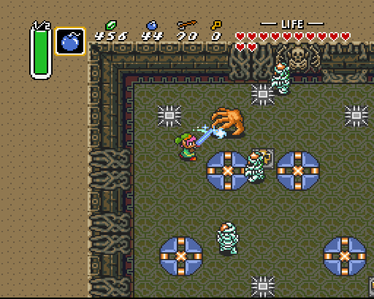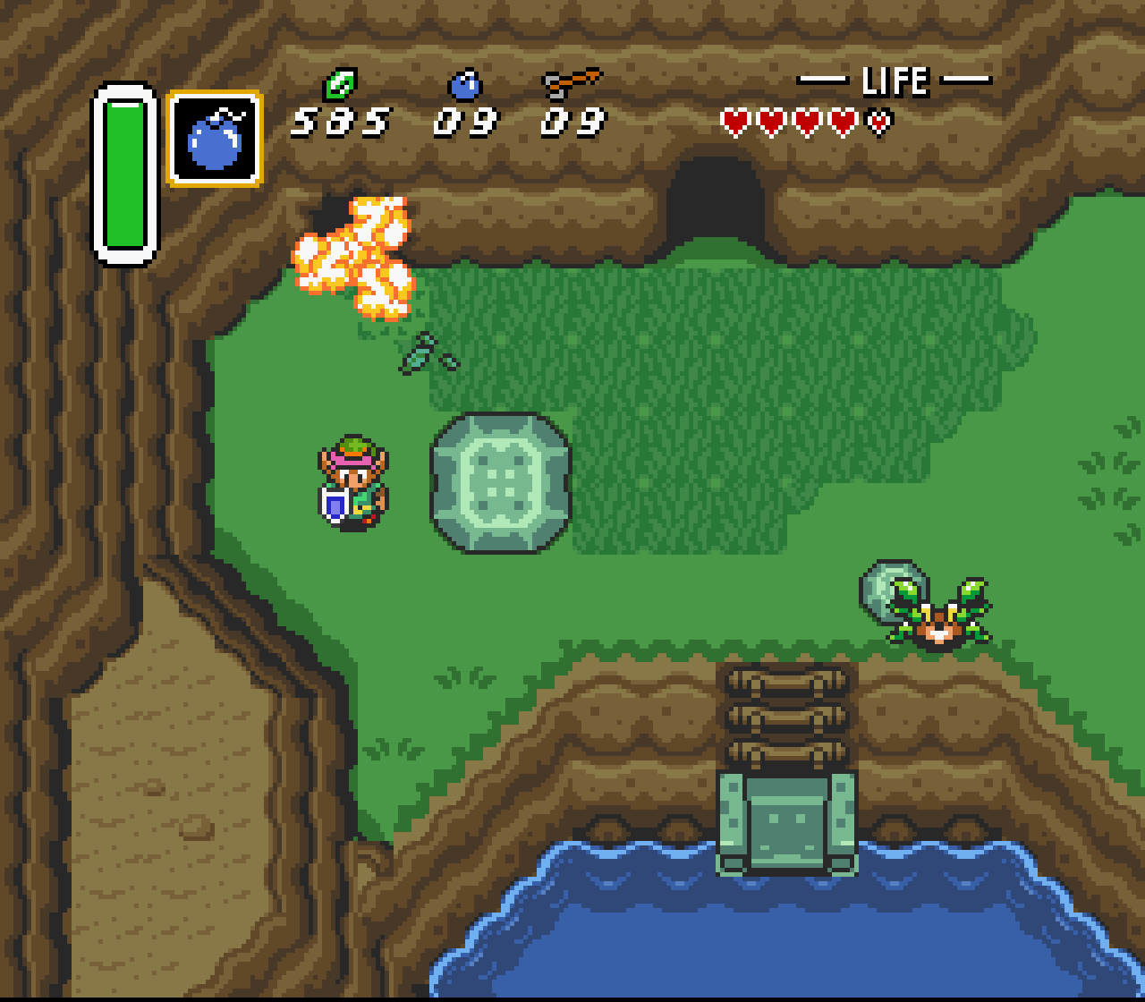 Alors certes, l'arc et les flèches, les bombes et le boomerang sont directement issus de l'épisode fondateur, d'ailleurs en connaissant bien cet épisode-là, on sait quoi faire face à un mur ébréché et on sait comment vaincre Ganon. Maintenant il faut être de sacrée mauvaise foi pour prétendre que cet épisode majeur n'a pas apporté une grande partie des bases dont la série se sert même plus de 30 ans après ! Des règles qui sont devenues des institutions, et on apprécie également de grandes améliorations depuis les épisodes NES comme le fait de pouvoir marcher en diagonales, de frapper en quart de cercle, de tirer/pousser des objets, ou encore la fameuse attaque tournoyante. Il est clair qu'en passant de 8 à 16-bits, il n'y a pas que les graphismes qui ont largement pris du galon.