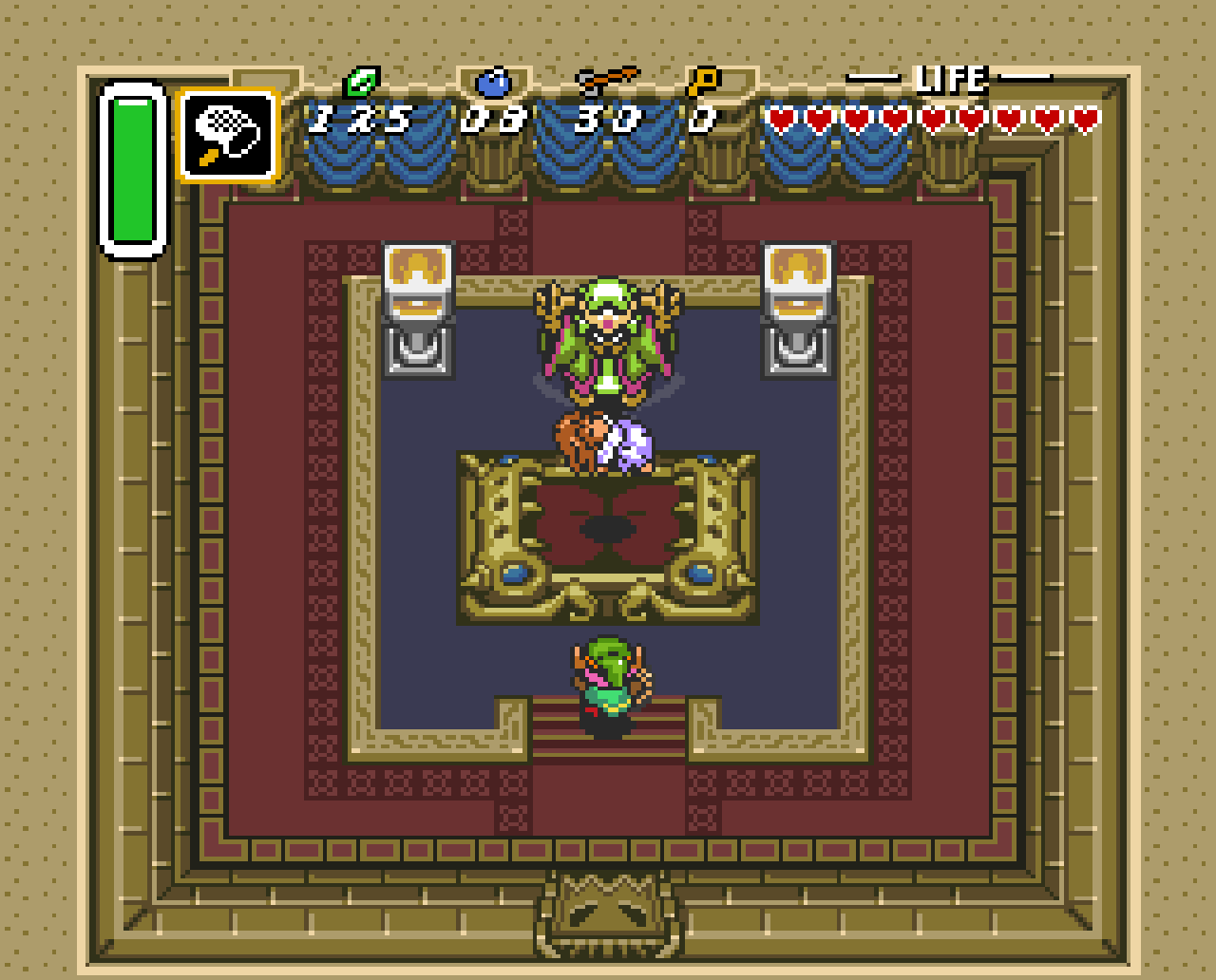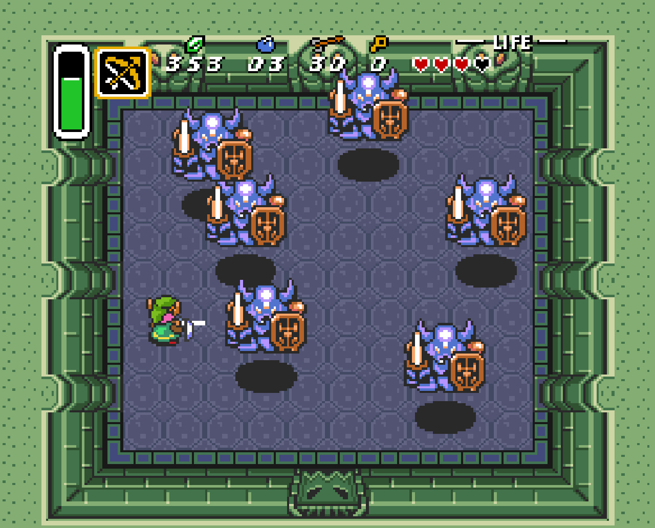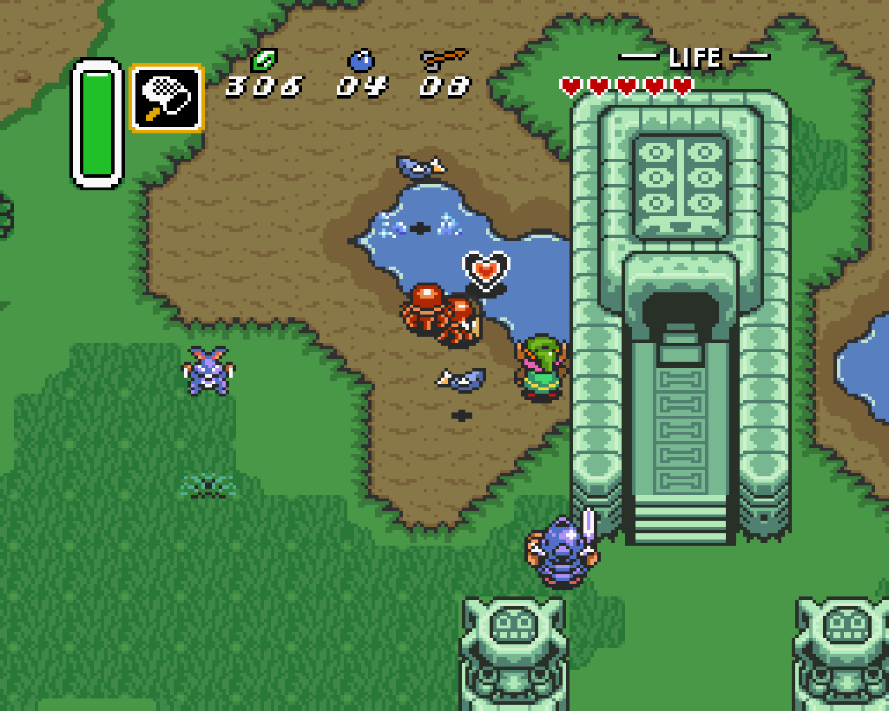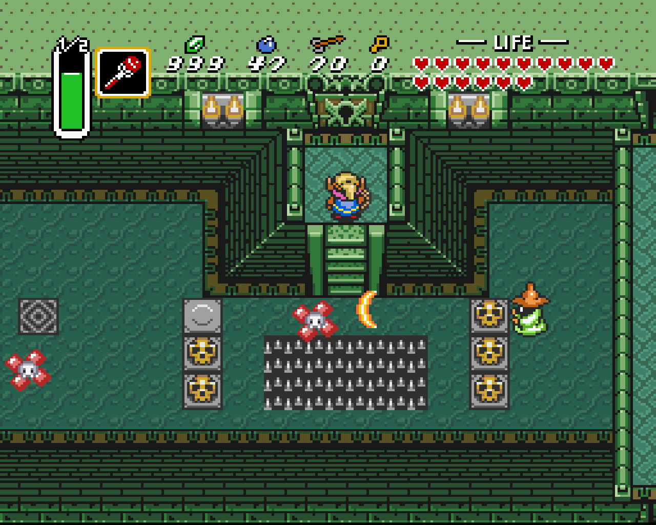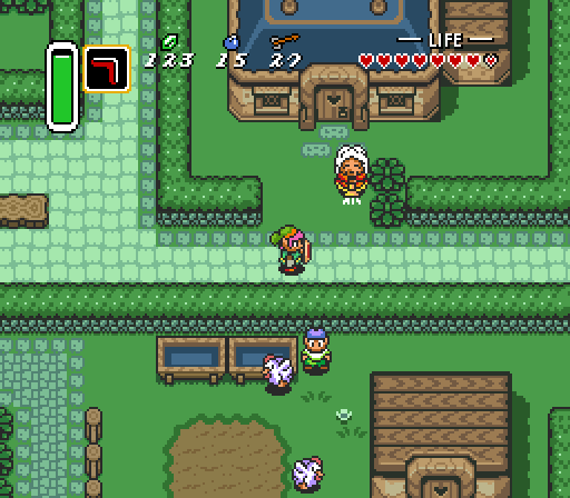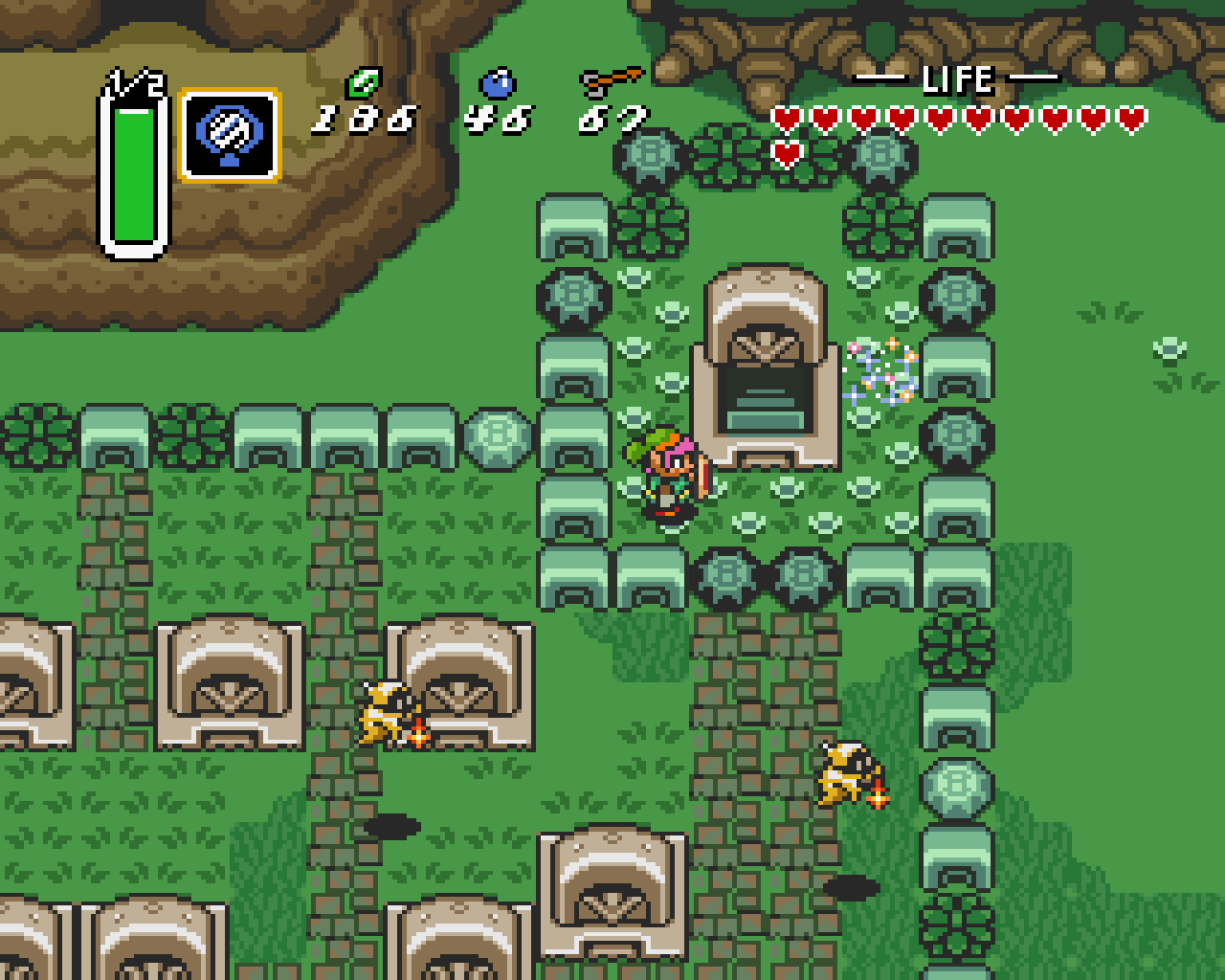 Alors certes, l'arc et les flèches, les bombes et le boomerang sont directement issus de l'épisode fondateur, d'ailleurs en connaissant bien cet épisode-là, on sait quoi faire face à un mur ébréché et on sait comment vaincre Ganon. Maintenant il faut être de sacrée mauvaise foi pour prétendre que cet épisode majeur n'a pas apporté une grande partie des bases dont la série se sert même plus de 30 ans après ! Des règles qui sont devenues des institutions, et on apprécie également de grandes améliorations depuis les épisodes NES comme le fait de pouvoir marcher en diagonales, de frapper en quart de cercle, de tirer/pousser des objets, ou encore la fameuse attaque tournoyante. Il est clair qu'en passant de 8 à 16-bits, il n'y a pas que les graphismes qui ont largement pris du galon.