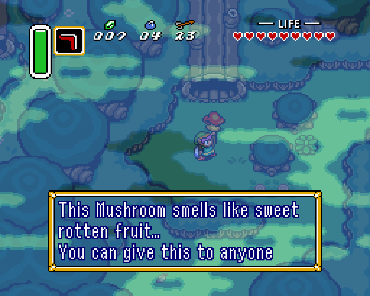 Vous l'aurez compris, sauce aventure / RPG oblige, notre petit Link disposera désormais d'une myriade d'objets, certains étant déjà connus (comme le boomerang, l'arc ou les bombes), d'autres étant introduits dans cet opus : poudre magique, flacons afin d'y conserver soit une fée soit de la potion, bâton de feu et de glace, la canne de Byrna (qui fait apparaître un halo de lumière qui rend Link invulnérable aux attaques ennemies et aux pics - bien pratique pour franchir certaines zones), la canne de Somaria qui créé des objets solides, le miroir magique, les bottes pour courir, la cape d'invisibilité qui permet de passer ennemis et pièges (Harry Potter n'a qu'à bien se tenir ^.^), les palmes qui permettent de nager, un livre pour traduire l'Hylien ancien, le grappin, le marteau, la lanterne mais aussi les 3 médaillons qui confèrent d'immenses pouvoirs magiques, ou encore les gantelets de force, qui permettent de soulever des objets lourds tels que les rochers.