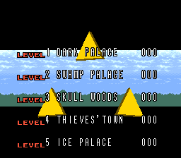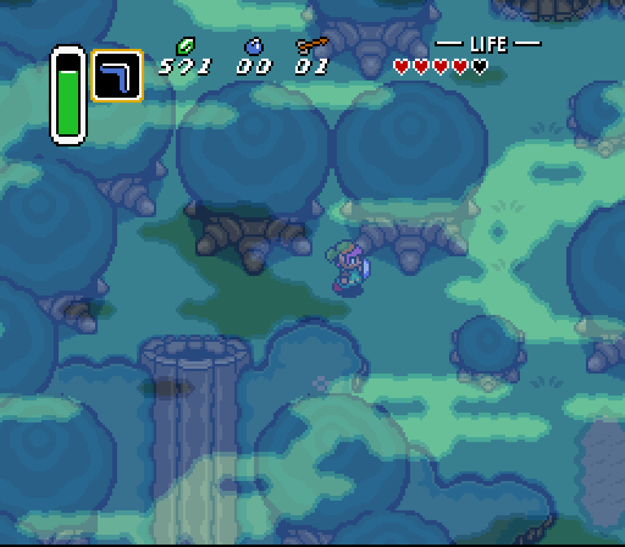 Par contre une fois du côté du Monde des Ténèbres, la chanson sera bien différente. Tout y est bien plus obscur, les pots en terre deviennent des cranes, l'entrée des donjons prennent parfois des visages de monstres, la belle eau bleue est devenue verdâtre, vaseuse, même les arbres arborent des trognes qui semblent tout droit sortis du côté obscur d'un conte pour enfant. Bien entendu tout ceci n'impressionnera que difficilement quelqu'un aujourd'hui, mais encore une fois, songez qu'à l'époque Zelda III était le fleuron du jeu d'aventure et que mine de rien, le jeu vidéo était encore considéré "pour les enfants" (moi-même je n'étais pas très vieux, c'était clairement une autre époque). Bref, la volonté de trancher radicalement entre le Monde de la Lumière et celui des Ténèbres est tout à fait probante, et parfaitement mise en œuvre. Ça explique aussi pourquoi la difficulté monte d'un coup : c'est une autre façon de montrer que les vacances sont finies et que la vraie aventure va demander de s'y investir. Même la musique prend une autre voie où, tout en restant épique, elle va prendre un accent plus inquiétant, rendant ce monde que plus hostile et inhospitalier.