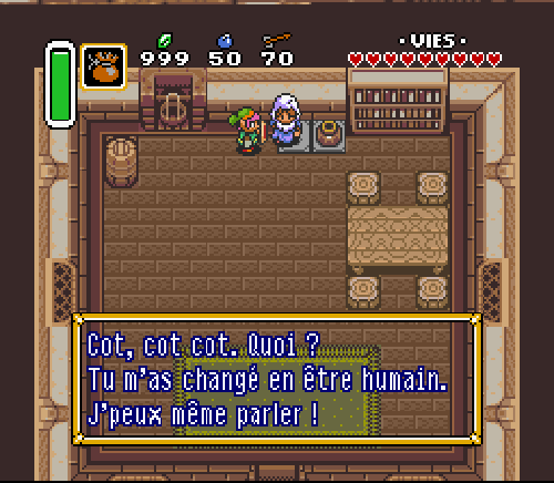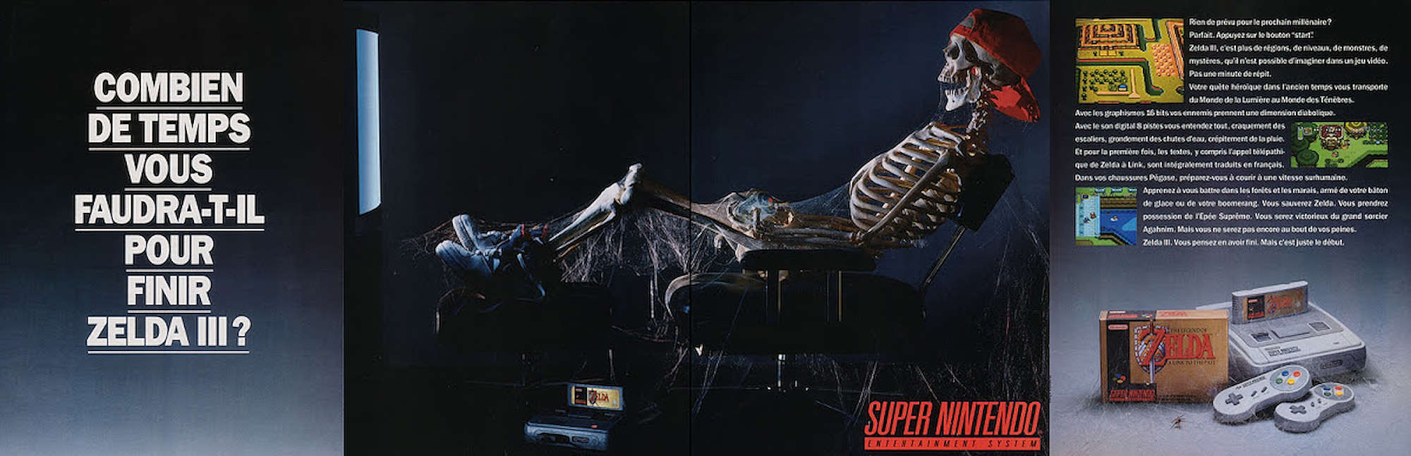 En France et au Canada, nous avons eu l'honneur de recevoir une version intégralement traduite... ce ne fut pas le cas de tous les pays lorsqu'on est un jeu d'exception, on sait se faire attendre avec un enthousiasme certain. D'ailleurs en France, Zelda III débarque dans une superbe version traduite, et à moins que je ne me trompe, c'est bel et bien le premier jeu traduit par Nintendo à fouler notre sol. Un honneur fort agréable car ainsi le jeu est adapté au mieux à son public, qui pourra dès lors profiter à son plein potentiel de la qualité de son écriture et de sa mise en scène. De plus, nul doute qu'en France tout le monde se souvient encore des superbes pubs papier de l'époque, et il est ainsi compréhensible qu'à la sortie de la Super Nintendo Mini (pas moins de 25 ans plus tard), nous fûmes largement frustrés de voir que cet indémodable titre n'était disponible qu'en anglais, comme si entre temps, le monde entier s'était exclusivement mis à la langue de Shakespeare.