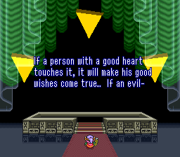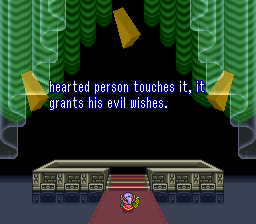 Et en parallèle on peut aussi souligner la médiocre qualité de la musique des boss, qui assume la même critique avec une boucle inintéressante de quelques secondes à peine, à ceci près que les boss ne durent pas assez longtemps pour nous inciter à couper le son. Tout ceci est bien dommage car je le répète, les bruitages sont de grande qualité, et les autres musiques sont des chefs-d'œuvre que seul le SCP700 de la Super Nintendo était capable de produire. Il est vraiment dommage qu'à l'image de l'opposition Lumière / Ténèbres, les musiques soient si bonnes d'un côté et si insupportables dans la durée lorsqu'on parcourt les donjons. C'est vraiment la seule véritable fausse note de tout le jeu...