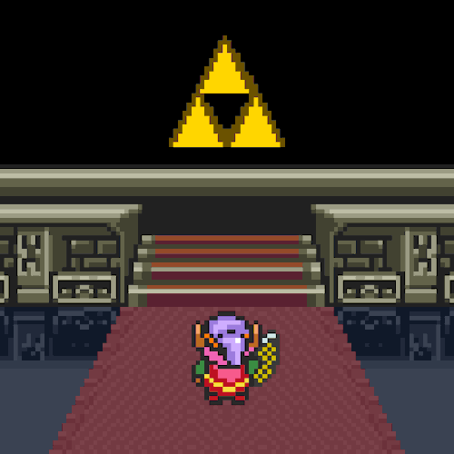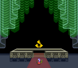 Enfin, le Mode7 est naturellement mis à contribution, mais toujours avec finesse. En effet, loin des effets "grand spectacle" d'un jeu d'action ou d'un shoot-them-up, notre Zelda III préfère jouer la carte de l'ambiance et de la maitrise, plutôt que de l'esbroufe. Comme évoqué, ça commence dès l'intro avec ce TriForce tout en réelle 3D (oui, bien que spécialisé dans le traitement d'effets 2D, le Mode7 peut gérer quelques polygones en Flat Shading, mais ça bizarrement, c'est une info qui a disparue des radars). Un effet qui sera repris tout au long du jeu, lorsqu'on délivrera les 7 descendants des Anciens (notez que pour gérer ça, le fond d'écran est généralement noir, afin d'éviter de saturer le processeur à effets, mais aussi pour donner plus d'impact à ce que le joueur a sous les yeux). Le Mode7 permet aussi quelques jolis effets de transparences, quelques morphings mais globalement, le jeu évite les extravagances et bien des effets (comme la petite distorsion de l'eau) ne sont que des frames d'animation.