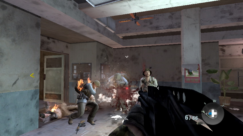 Fort du célèbre mode zombie de World at War (un mode à succès que tout le monde copie désormais, même dans les jeux les moins adaptés à l'exercice), il fait son come-back. 3 maps dédiées, des personnages incongrus et des zombies... bref de quoi se marrer même si on n'est pas dans Dead Rising pour autant. Question prise en mains, on retrouve l'exacte maniabilité de Modern Warfare (la configuration des touches et les réglages inclus) avec le bon goût que les développeurs ont mieux gérer tout ça. A côté de ses 2 prédécesseurs, Black Ops est largement plus jouable. La caméra ne part plus dans tous les sens, la visée est plus souple et bien moins exigeante. Afin de faciliter encore un peu plus le jeu, les ennemis sont moins nombreux que sur consoles HD et généralement, ils ne nous visent pas. Que voulez-vous, c'est une habitude que les versions Wii soient plus faciles que les autres. Question de public et de prise en mains je suppose.